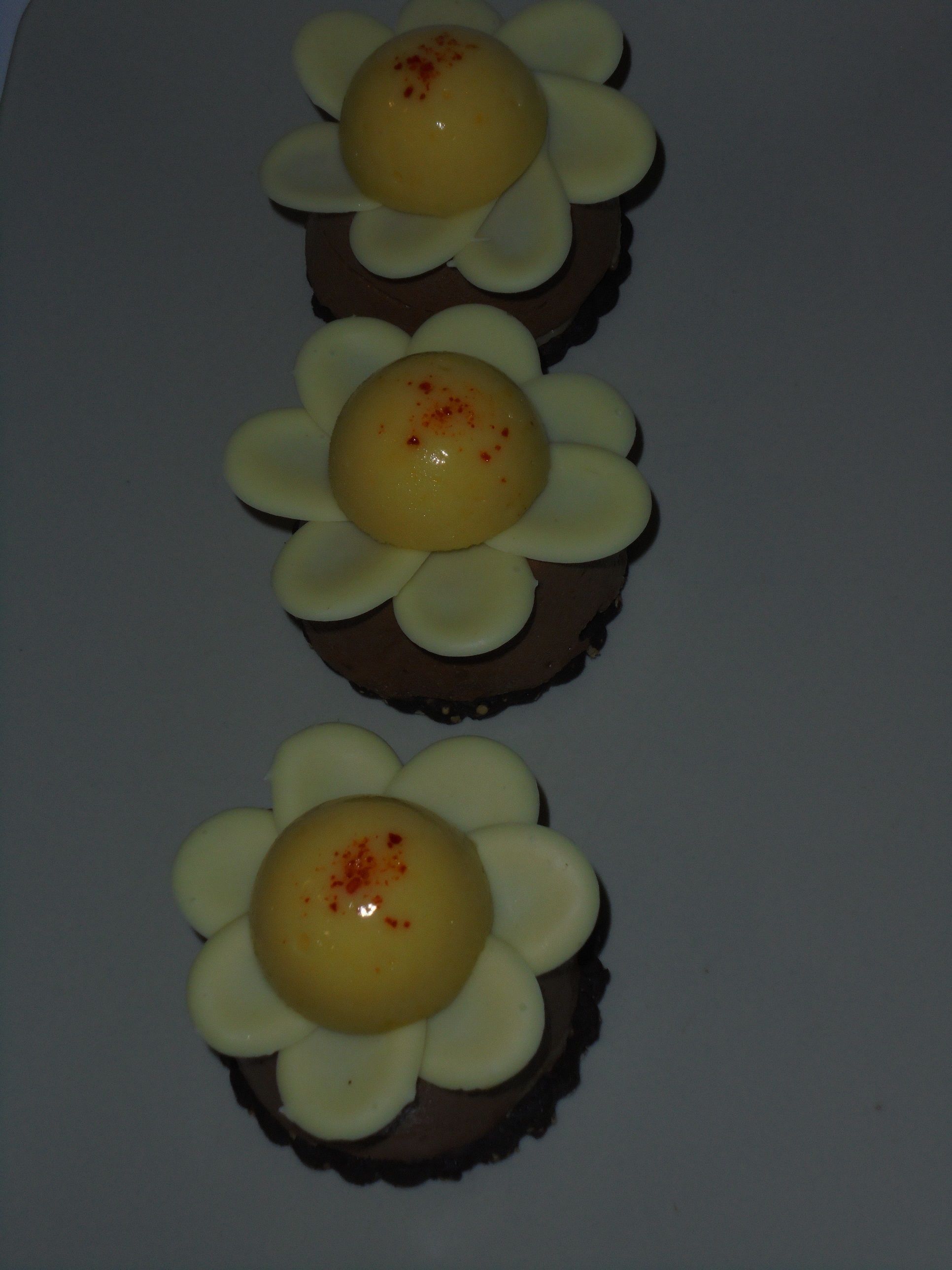 Faites fondre doucement le chocolat blanc au bain-marie ou au micro-ondes, versez le chocolat dans une poche à douille. Faites des points de chocolat blanc d’environ 1 cm, puis à l’aide d’une spatule écrasée légèrement juste sur un côté pour faire des pétales. Réservez au frais.