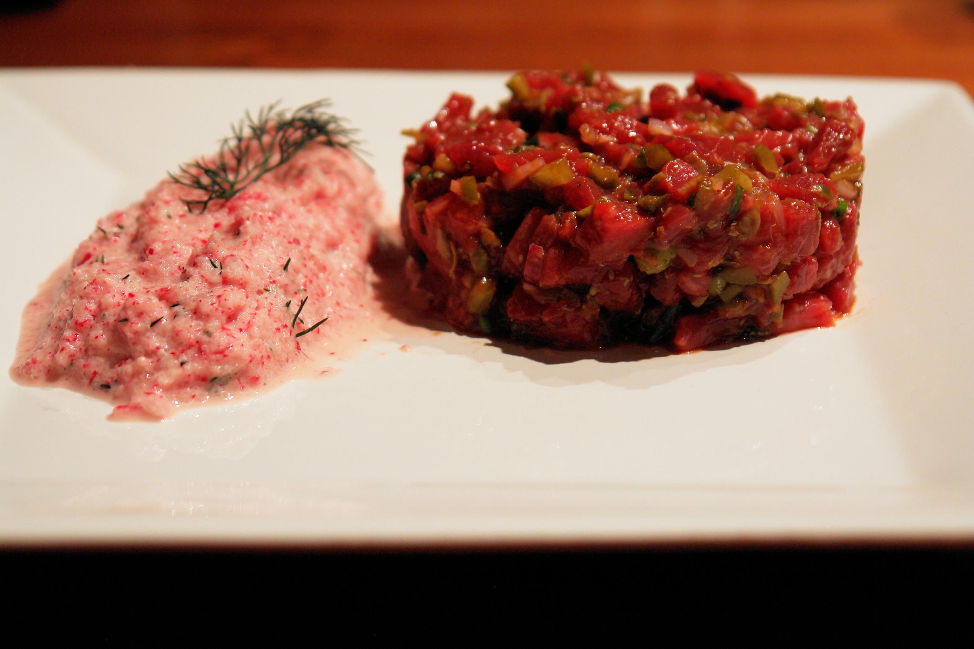 salut les gourmands, je vous présente ici un tartare au couteau avec oignon, capres, cornichon, un peu de ciboulette, concentré de tomate ,tabasco, sauce worcestershire, et un jaune d'oeuf, et pour la remoulade c'est du radis rapé avec une petite mayonaise par ici la recette: