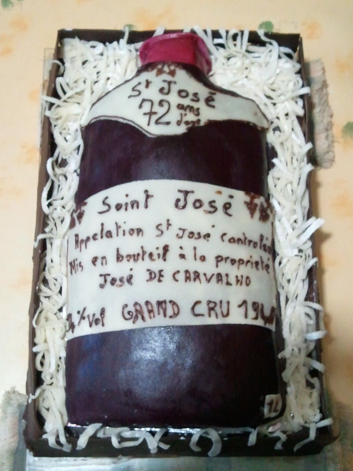 Alors la caisse est un poire chocolat avec une ganache et des poires fraiches, et la bouteille est un fraisier avec une crème diplomate et des fraises