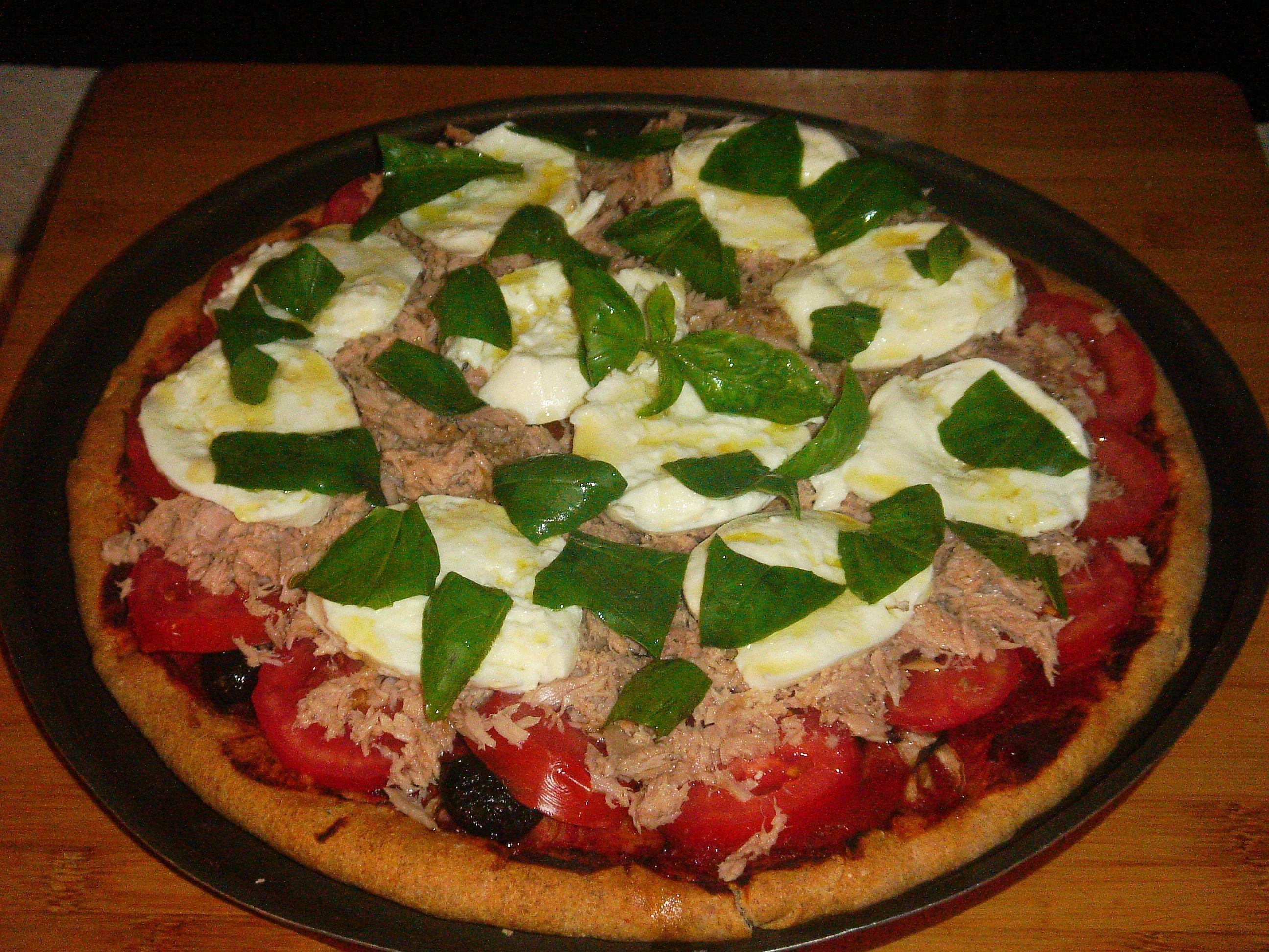 Je vous présente aujourd’hui une pizza avec du thon, des tomates, de la mozza et du basilic avec en base une pâte au blé complet et céréales, un plat bien complet et équilibré a dégusté avec une bonne salade verte avec mon partenaire la case à vanille.